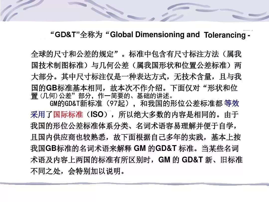 GD&T是產(chǎn)品實(shí)現(xiàn)過(guò)程的重要工具,廣泛地應(yīng)用于設(shè)計(jì)和質(zhì)量部門,包括機(jī)械圖紙的讀圖、解釋和理解,是實(shí)現(xiàn)和理解客戶要求的專業(yè)語(yǔ)言。相當(dāng)一部分質(zhì)量管理人員對(duì)正確地理解圖紙甚少或一知半解,這個(gè)不懂真不行??!本文PPT培訓(xùn)教材,幫助您快速理解和應(yīng)用GD&T,歡迎收藏學(xué)習(xí)!