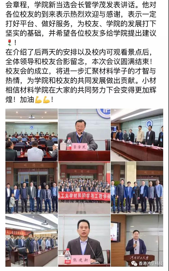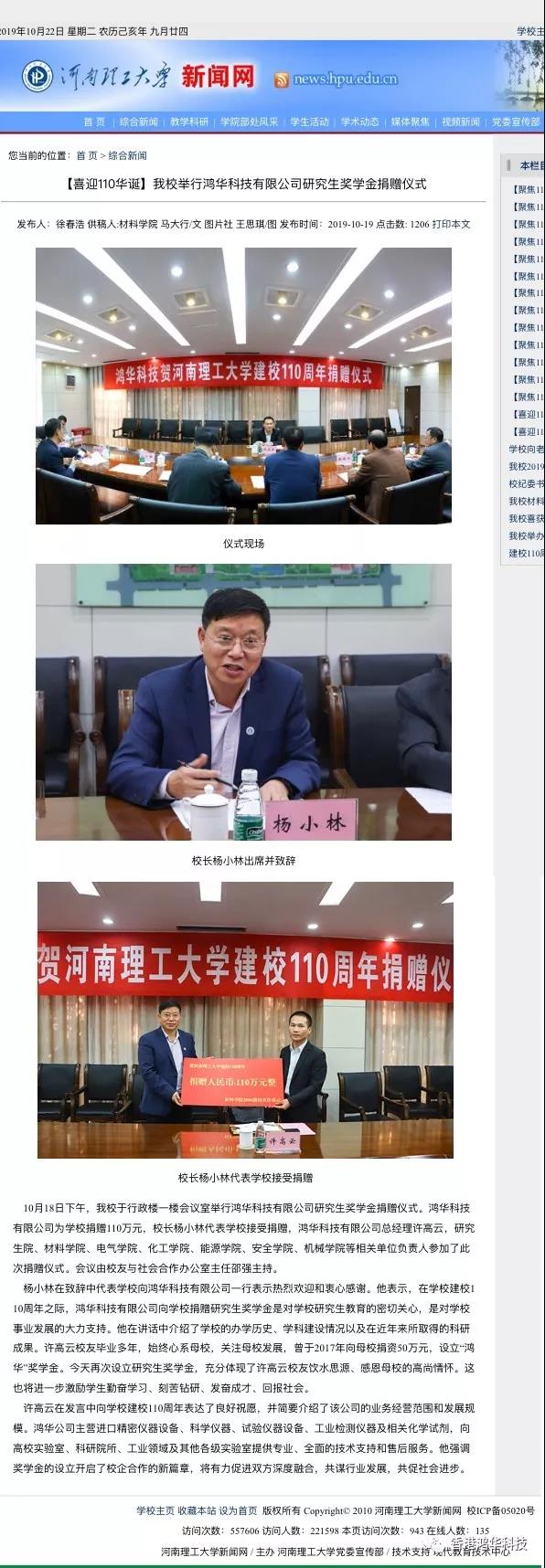 金秋十月,在偉大祖國慶祝建國70周年華誕之際,河南理工大學(xué)迎來了建校110周年慶典,一大批優(yōu)秀的校友們紛紛回校表示對(duì)母校的祝賀和感恩。鴻華科技有限公司總經(jīng)理許高云先生回到母校參加了一些列校慶活動(dòng),并向母校捐獻(xiàn)110萬元設(shè)立研究生獎(jiǎng)學(xué)金;同時(shí)鴻華科技有限公司在河南理工大學(xué)材料科學(xué)與工程學(xué)院校友會(huì)成立大會(huì)上被推選為河南理工大學(xué)材料科學(xué)與工程學(xué)院校友會(huì)理事單位。