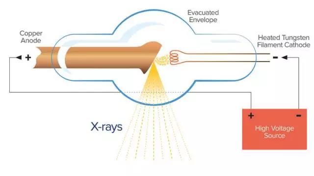 X 射線管是工作在高電壓下的真空二極管,其包含有兩個(gè)電極:一個(gè)是用于發(fā)射電子的燈絲,作為陰極;另一個(gè)是用于接受電子轟擊的靶材,作為陽極。兩級均被密封在高真空的玻璃或陶瓷外殼內(nèi)。施加到該燈絲上的電流使其加熱至1000攝氏度,因此它能發(fā)射出電子。一旦燈絲發(fā)射出電子,在燈絲和陽極之間施加高電壓以加速電子在燈絲與陽極之間的移動。加速電子與陽極之間的相互作用即可以引起X射線的產(chǎn)生。陽極材料中的元素類型決定了發(fā)射出來X射線的能量大小。